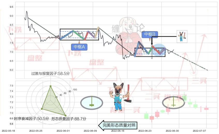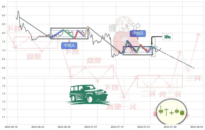 ➣ 【中枢B】:2022-05-24-2022-07-26,中枢由6笔构成,共45交易日, ZG=7.19, ZD=6.90