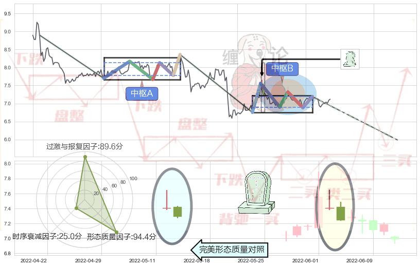 ➢ 看跌(高位倒锤头)流星线 🔜 缠论中枢点破位中枢B支撑下拉 综合量化分数:44.27 【偏空】
