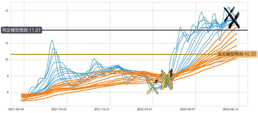 ➣ 34小时均线于(2022-08-08: 12.35)形成【死叉】基于【死叉历史模型】预测死叉后最低波谷价格: 11.74, 死叉后最低价格12.11,尚未达到预测最低波谷价格, 预期继续下跌