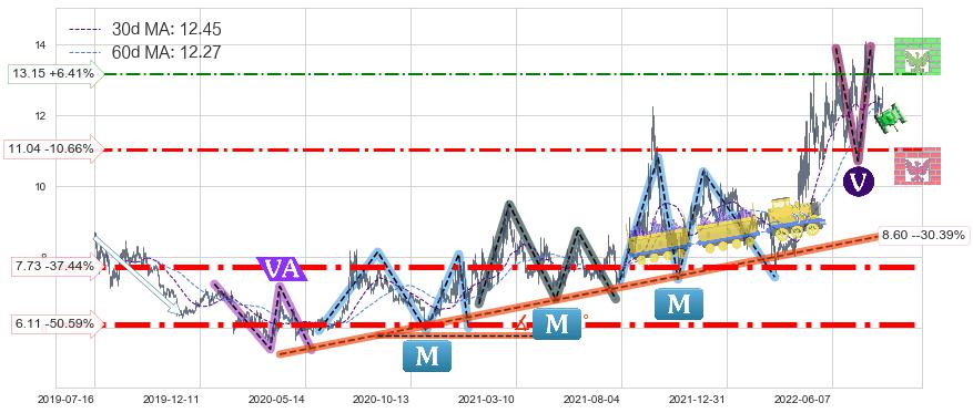 ♘ 阻力价格位13.15,可信任强度54.12%,距离最后交易2022-08-12形成的收盘价格12.36相差 +6.41%