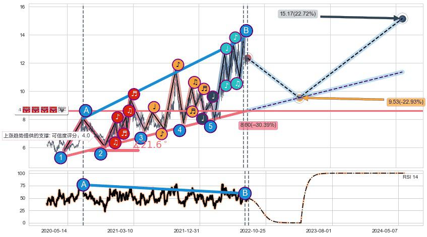 ♘ 在最后的上升阶段2020-04-07至2022-08-12存在 持续未破位的支撑位 ,支撑价格8.60,支撑可信任强度84.17%,其距离最后价格12.36相差 -30.39%