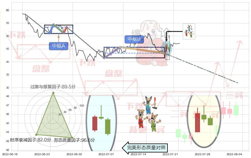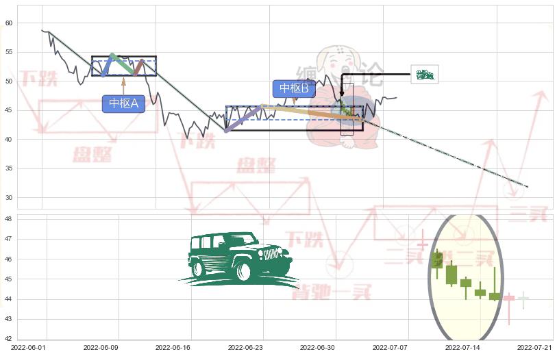 ➣ 【中枢B】:2022-04-25-2022-07-22,中枢由3笔构成,共61交易日, ZG=45.67, ZD=43.27