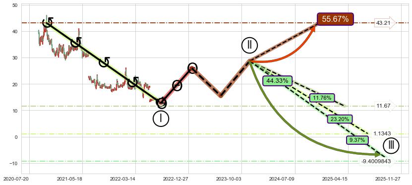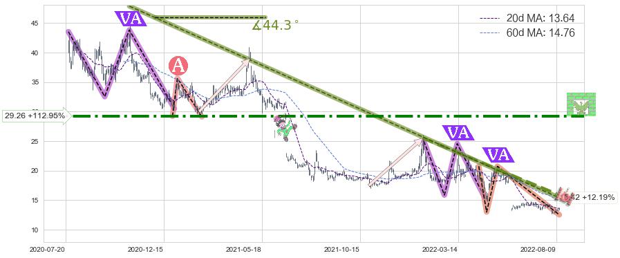 从2020-10-27至2022-08-12,共包含439个交易日,阶段股价下跌-88.94%,阶段股价变动位移路程比: 1 : 9,下跌趋势角度: 44.3,2021-06-23向↘︎形成缺口,跳空下跌-28.64%˚