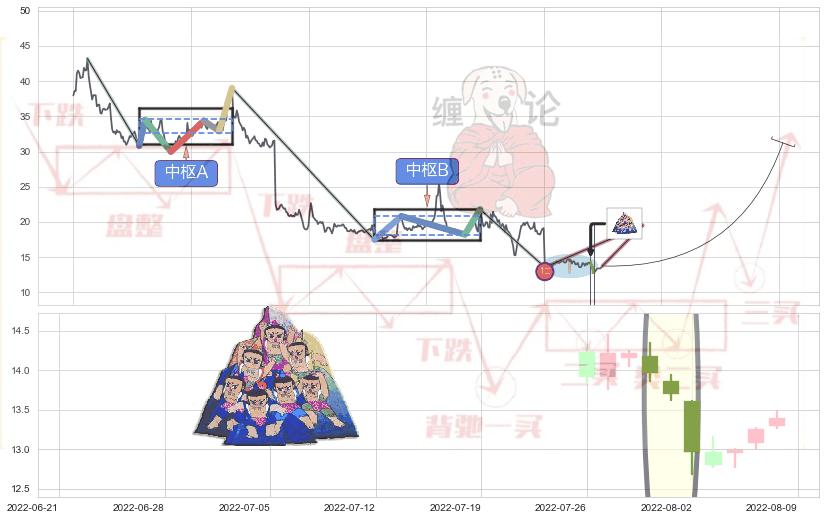 从2022-01-14至2022-08-12,共包含140个交易日,阶段股价下跌-49.92%,阶段股价变动位移路程比: 1 : 6,下跌趋势角度: 35.8,2022-06-06向↘︎形成缺口,跳空下跌-29.03%˚
