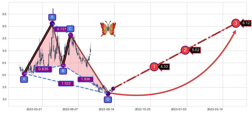➣ 已完成【蝴蝶】形态起点X: 2022-02-10, 终点D: 2022-08-03, 共117交易日