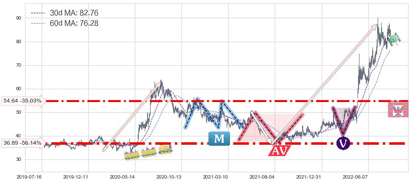 ♞ 30日均线:82.76,60日均线:76.28→ 快线>慢线