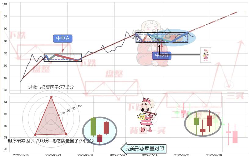 ➣ 【中枢B】:2022-07-08-2022-08-09,中枢由5笔构成,共23交易日, ZG=85.53, ZD=79.57