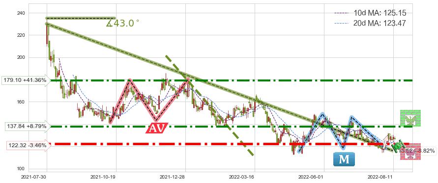 ♘ 阻力价格位137.84,可信任强度83.06%,距离最后交易2022-08-12形成的收盘价格126.70相差 +8.79%