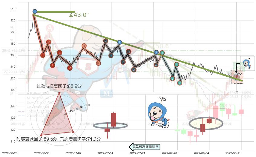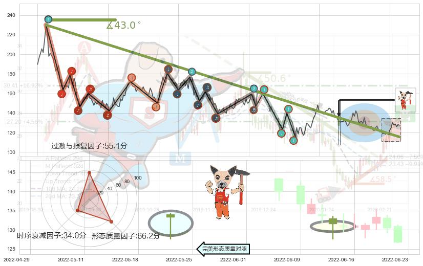 从2021-07-30至2022-05-20,共包含193个交易日,阶段股价下跌-37.22%,阶段股价变动位移路程比: 1 : 13,下跌趋势角度: 43.0