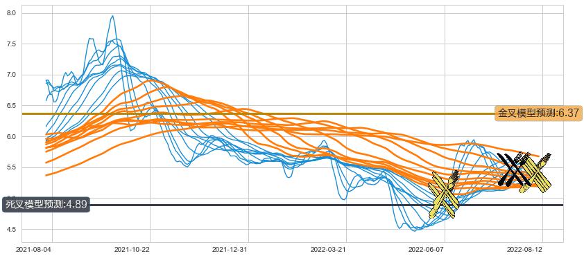 ➢ 40小时均线于(2022-07-22: 5.47)形成【死叉】基于【死叉历史模型】预测死叉后最低波谷价格: 4.96, 死叉后最低价格5.17,尚未达到预测最低波谷价格, 预期继续下跌