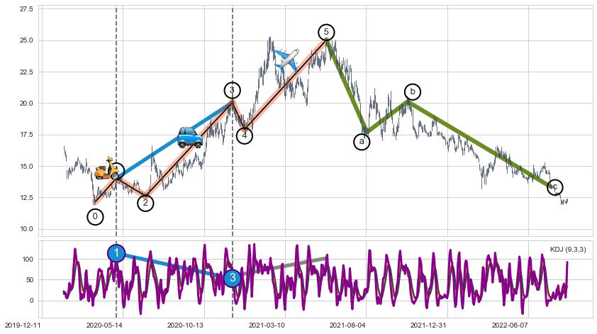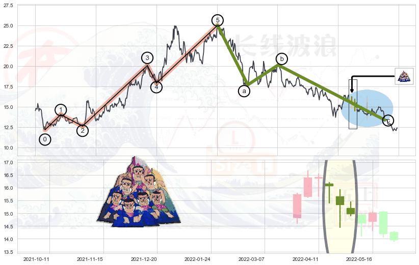 ➣ 波浪理论:猜想达到c点后小回调终止反转上涨 → 上涨 → 【拐点】临近 → 阶段均值回复结束后继续大周期趋势跟踪