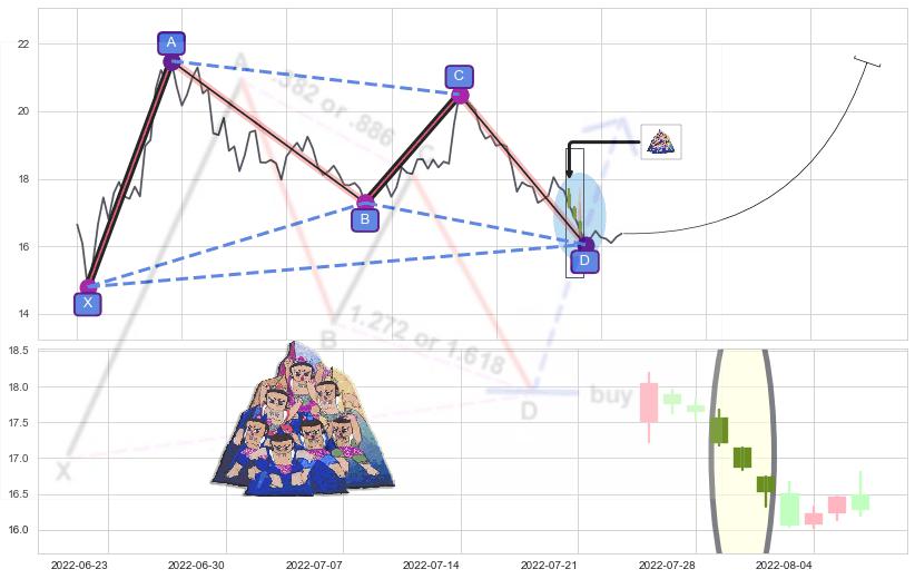 ➢ 谐波伽利:c下跌到达d:猜想拉升 → 上涨 →【拐点】强支撑临近 → 大趋势均值回复