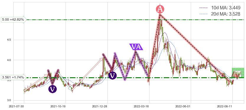 ♘ 阻力价格位3.561,可信任强度69.22%,距离最后交易2022-08-12形成的收盘价格3.500相差 +1.74%