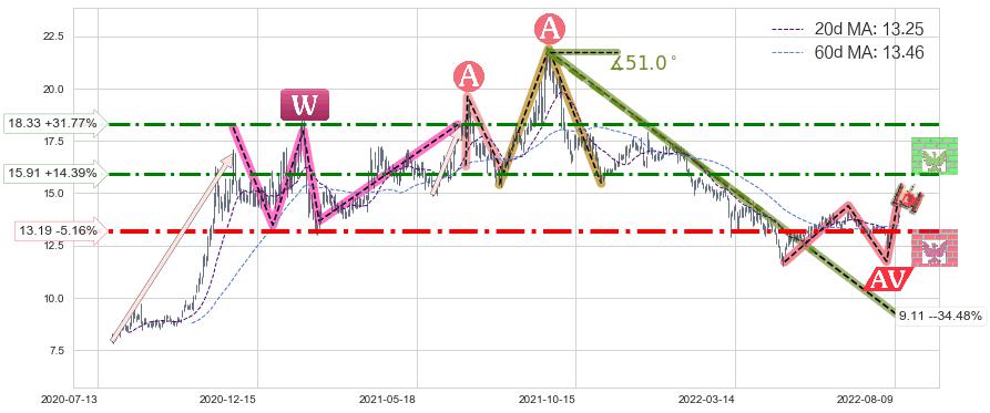 ♘ 阻力价格位15.91,可信任强度59.69%,距离最后交易2022-08-12形成的收盘价格13.91相差 +14.39%