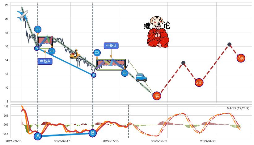 ➣ 缠论中枢点:猜想破位中枢B后持续下拉 → 下跌 → 破位中枢B支撑 → 持续趋势跟踪