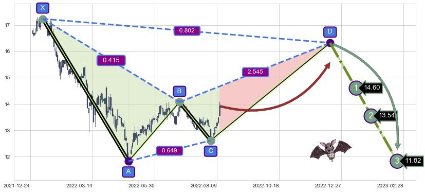 ➣ 未完成【蝙蝠】形态起点X: 2022-01-10, 已到达C点: 2022-08-02, 预测最终D点: 2022-12-14, 共231交易日