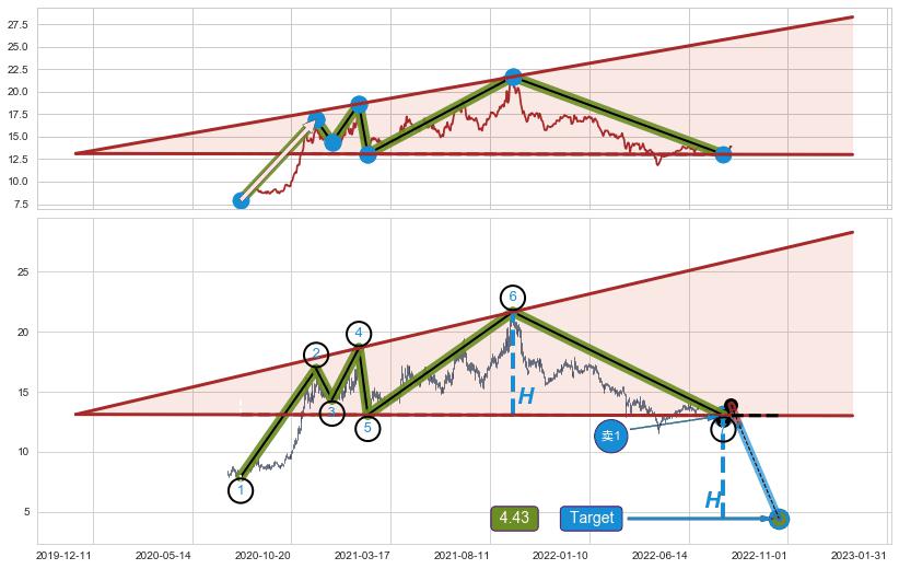 ➣ AI预测: 假定反转启动后, 第❶目标位置(2023-01-12, 14.60)