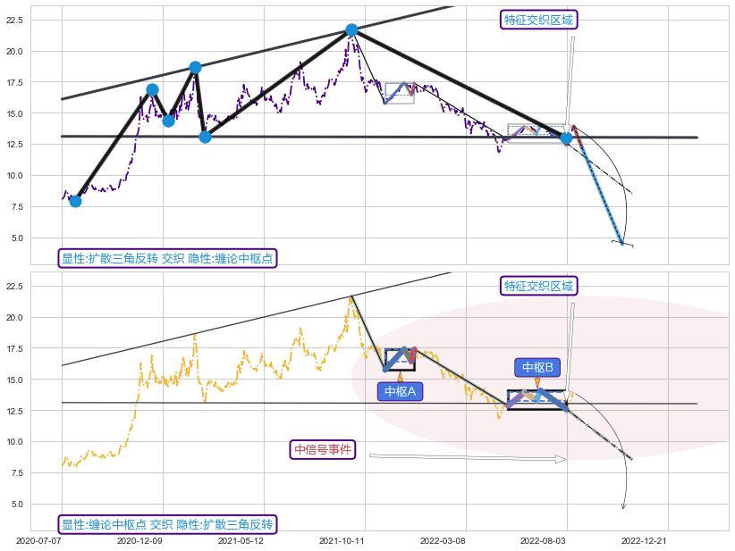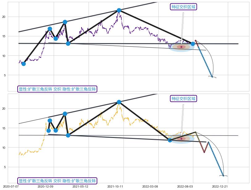 ➣ 扩散三角反转:猜想临近关键支撑位突破点 → 临近拐点下跌 → 风险信号 → 大趋势均值回复