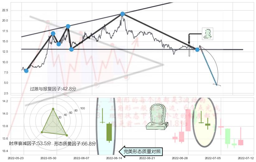 ➢ 看跌(高位倒锤头)流星线 + 扩散三角反转支撑破位转换阻力下跌信号叠加后【反向回撤率】中等,【看空】信号叠加【存续影响中等】