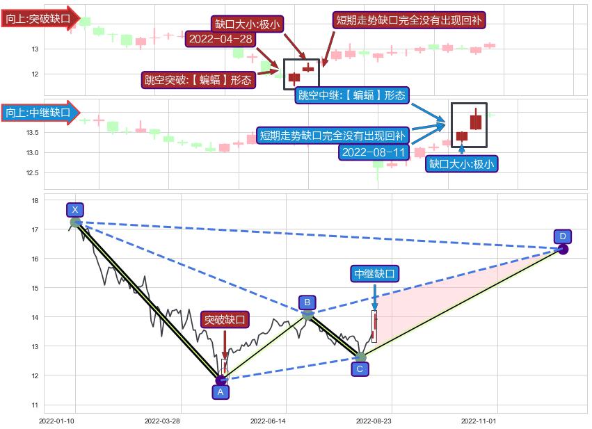 ➢ 跳空突破【蝙蝠】形态关键点后,后续非关键走势也无缺口回补迹象,突破缺口可信度提高