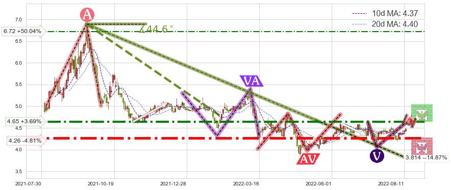 ♘ 阻力价格位4.65,可信任强度81.06%,距离最后交易2022-08-12形成的收盘价格4.48相差 +3.69%