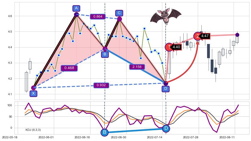 ➣ 已完成【蝙蝠】形态起点X: 2022-05-24, 终点D: 2022-07-15, 共38交易日