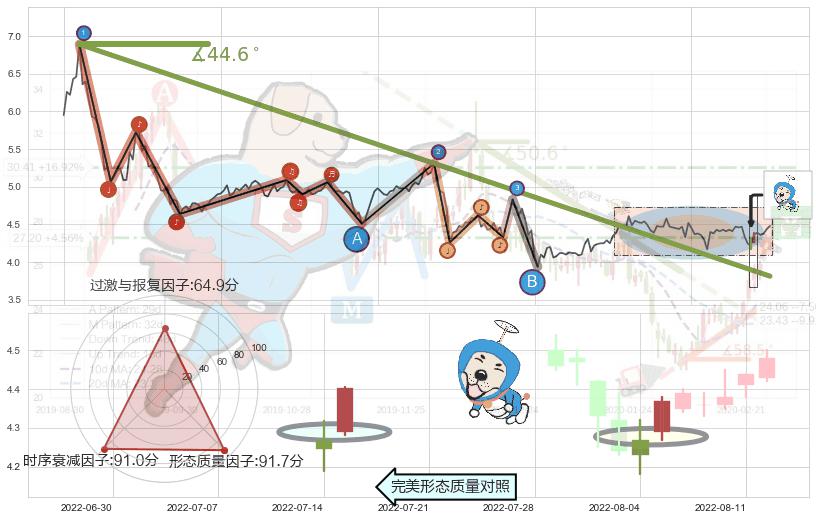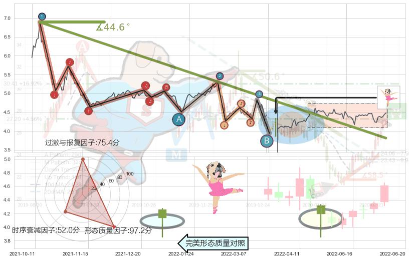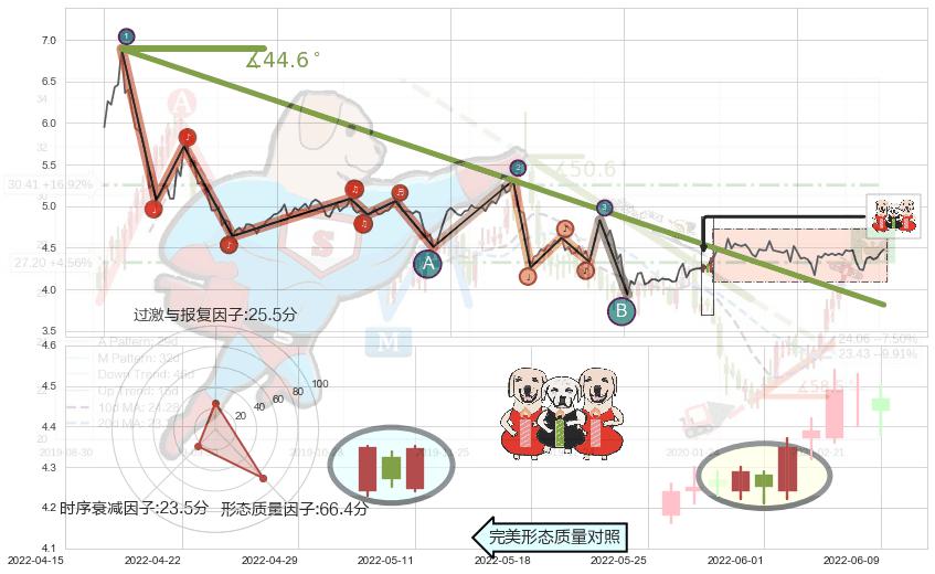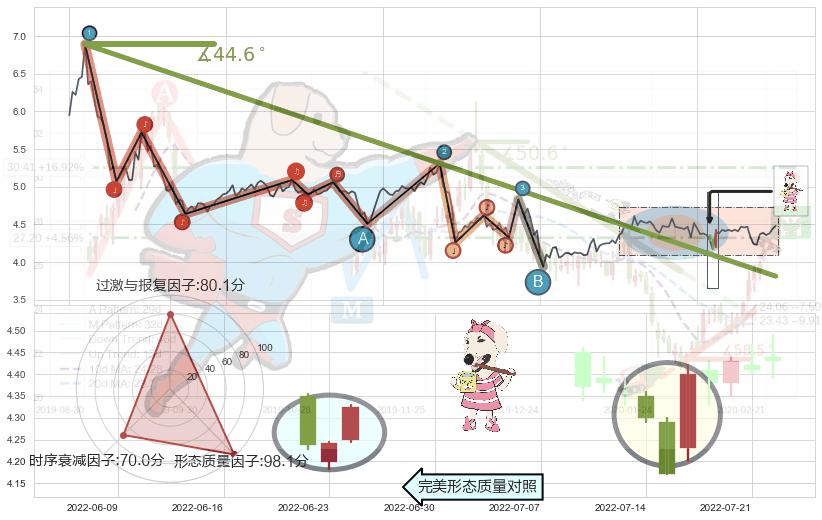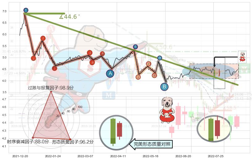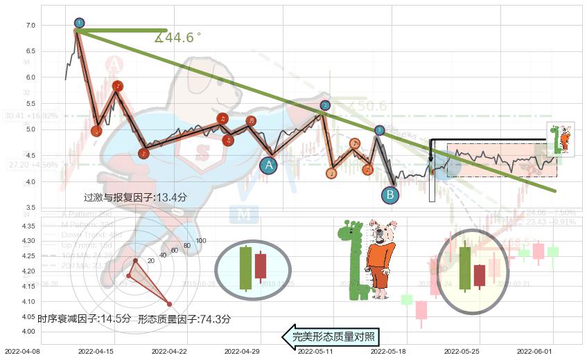➢ 2021-09-13-2022-05-17下跌趋势存在反转上涨[机会],其原下跌趋势的阻力位(3.814)已被突破[强支撑信号],原下跌趋势角度: 44.6˚