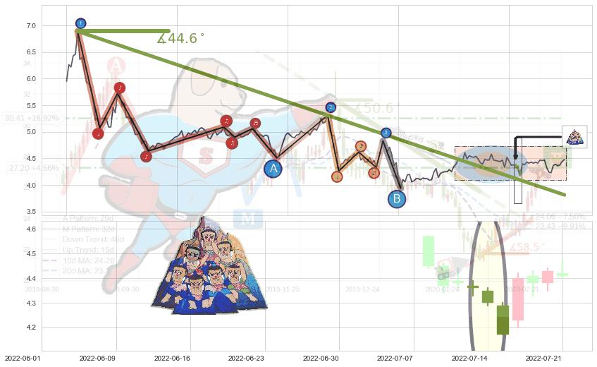➣ 2021-09-13-2022-05-17下跌趋势存在反转上涨[机会],其原下跌趋势的阻力位(3.814)已被突破[强支撑信号],原下跌趋势角度: 44.6˚