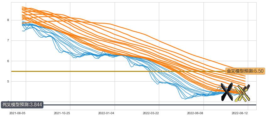 ➢ 40小时均线于(2022-07-14: 4.49)形成【死叉】基于【死叉历史模型】预测死叉后最低波谷价格: 3.831, 死叉后最低价格4.28,尚未达到预测最低波谷价格, 预期继续下跌