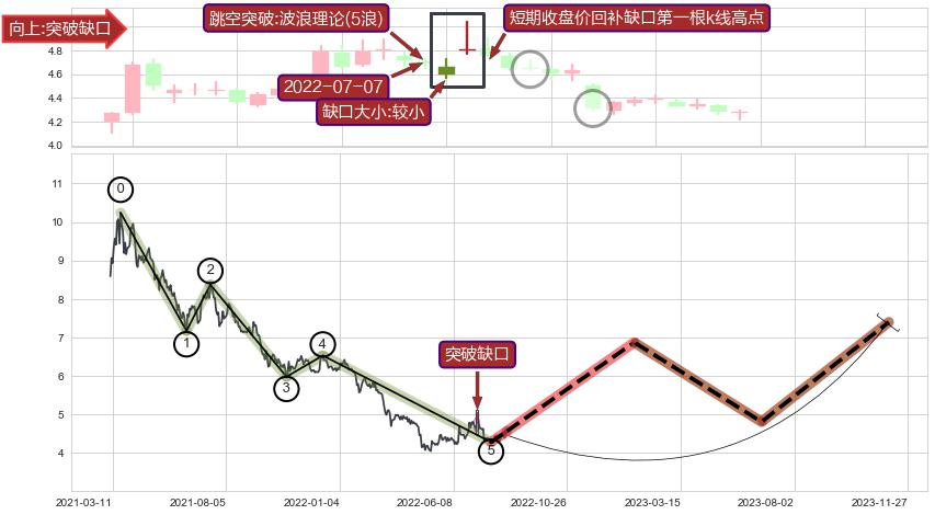 ➣ 突破缺口形成后,后续k已经超过14根,跳空突破波浪理论(5浪)关键点后, 出现【完全回踩】迹象,短期收盘价回补缺口第一根k线低点