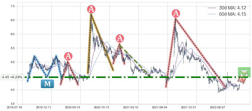 2022-06-15: 第一阻力位4.45强力阻拦了上升趋势,成功阻止了价格的继续上涨。