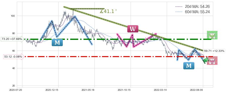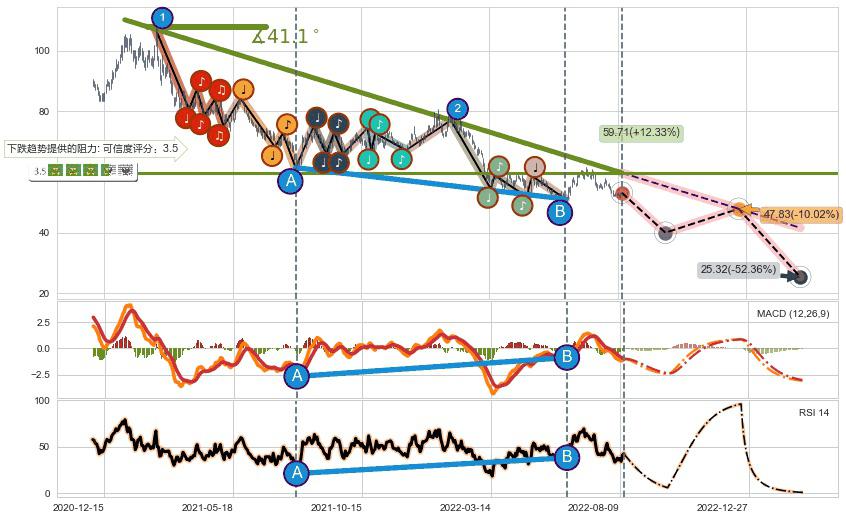 ♘ 在最后的下跌阶段2021-01-07至2022-06-29,存在 持续未破位的阻力位 ,阻力价格59.71,可信任强度81.01%,其距离最后价格53.16相差 +12.33%