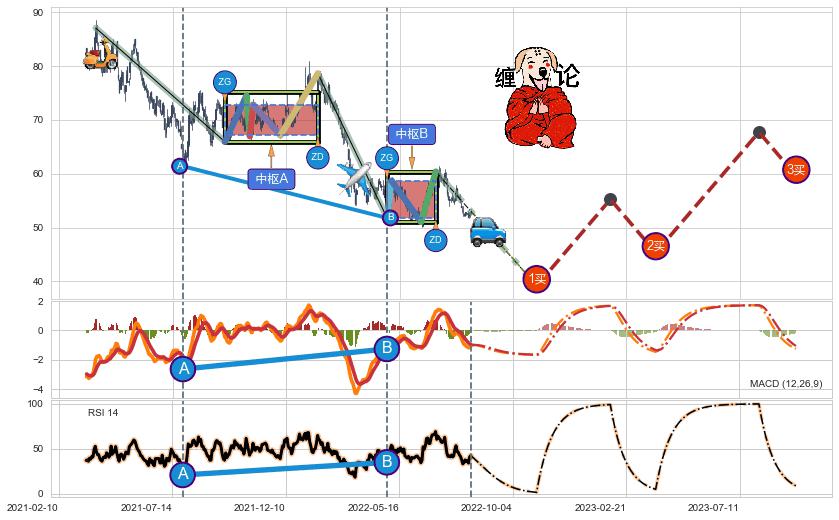 ➢ 缠论中枢点:猜想破位中枢B后持续下拉 → 下跌 → 破位中枢B支撑 → 持续趋势跟踪