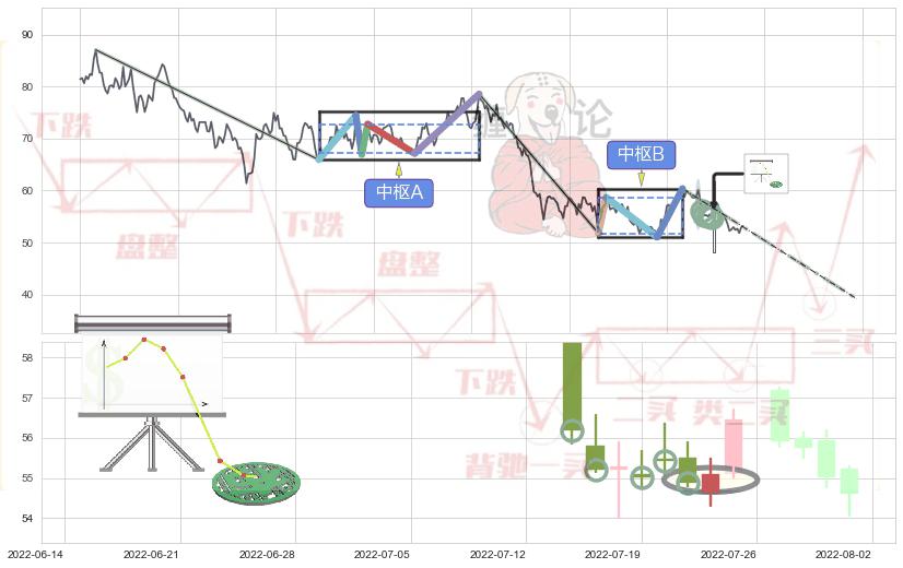 ➣ 【中枢B】:2022-04-26-2022-06-30,中枢由4笔构成,共44交易日, ZG=58.70, ZD=51.79