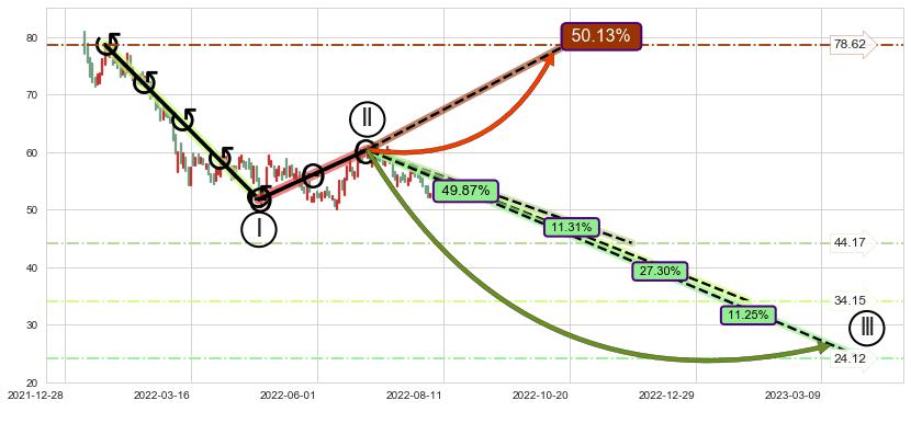 ➣ 下降插入线(坠落线) + 波浪理论c点反弹终止反转下跌信号叠加后【目标达成率】中等,【看空】信号叠加【存续影响中等】