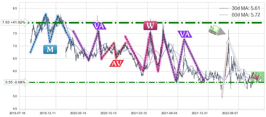 ♘ 阻力价格位7.93,可信任强度92.56%,距离最后交易2022-08-12形成的收盘价格5.59相差 +41.92%