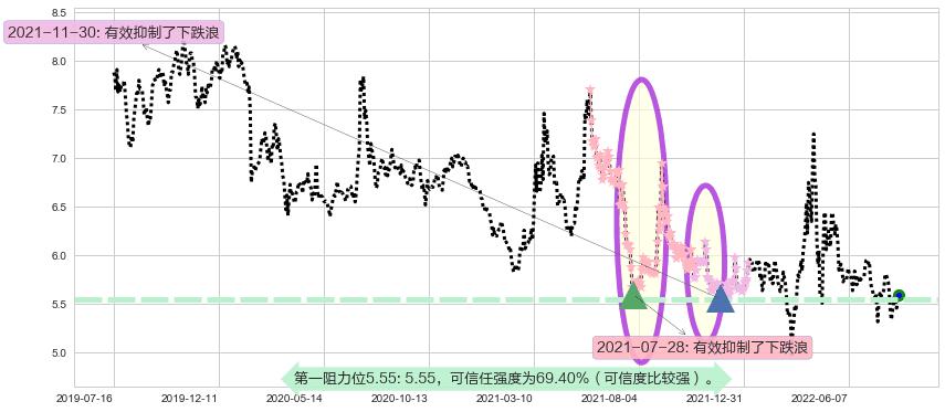 ♘ 阻力价格位5.55,可信任强度69.40%,距离最后交易2022-08-12形成的收盘价格5.59相差 -0.68%
