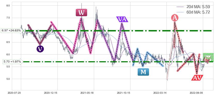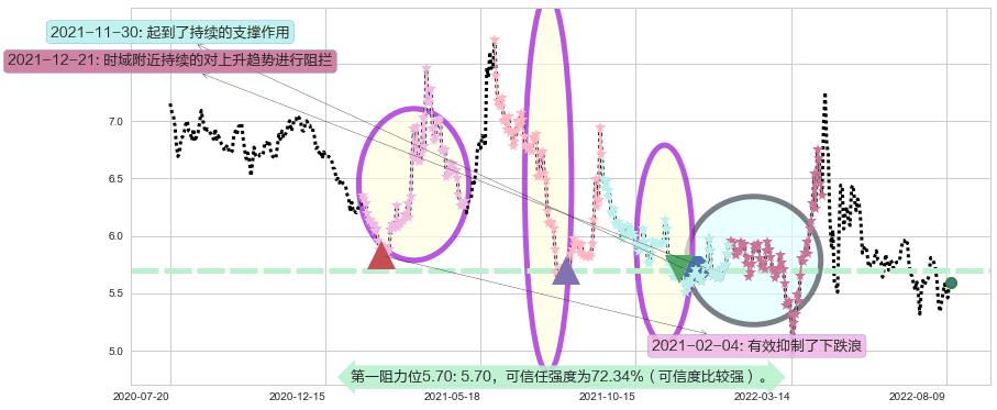 ♘ 阻力价格位5.70,可信任强度72.34%,距离最后交易2022-08-12形成的收盘价格5.59相差 +1.97%