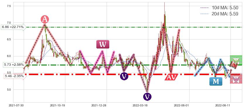 ♘ 阻力价格位5.73,可信任强度56.57%,距离最后交易2022-08-12形成的收盘价格5.59相差 +2.58%