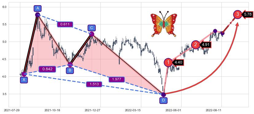 ➣ 已完成【蝴蝶】形态起点X: 2021-08-05, 终点D: 2022-04-27, 共174交易日
