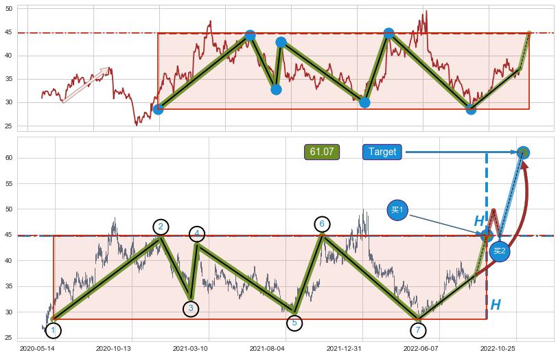 ➣ 上涨矩形整理:猜想临近关键阻力位突破点 → 临近拐点上涨 → 机会信号 → 大趋势均值回复