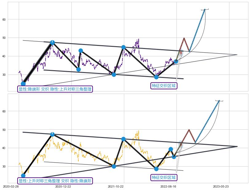 ➣ 上升对称三角整理:猜想临近关键阻力位突破点 → 临近拐点上涨 → 机会信号 → 大趋势均值回复