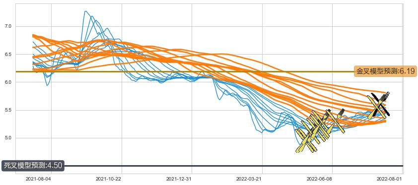 ➢ 5小时均线于(2022-07-26: 5.59)形成【死叉】基于【死叉历史模型】预测死叉后最低波谷价格: 4.50, 死叉后最低价格5.59,尚未达到预测最低波谷价格, 预期继续下跌