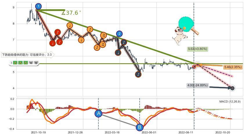 ♘ 在最后的下跌阶段2021-09-23至2022-05-10,存在 持续未破位的阻力位 ,阻力价格5.53,可信任强度74.78%,其距离最后价格5.33相差 +3.80%