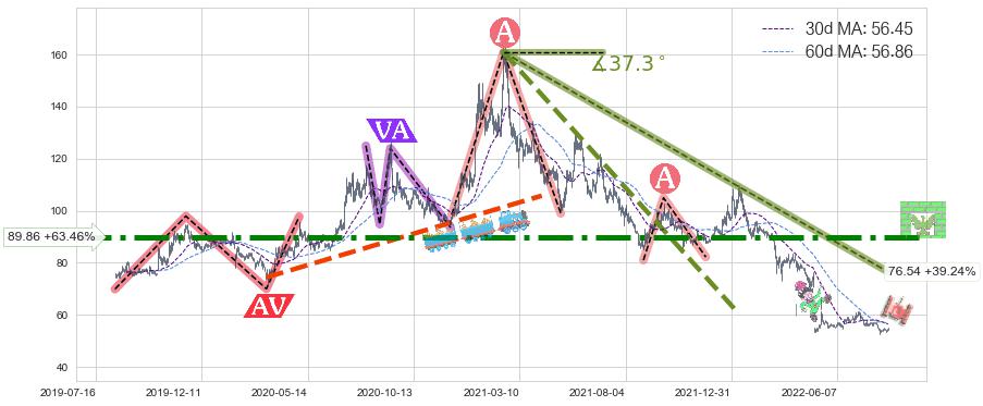 ♘ 阻力价格位89.86,可信任强度92.42%,距离最后交易2022-08-12形成的收盘价格54.97相差 +63.46%