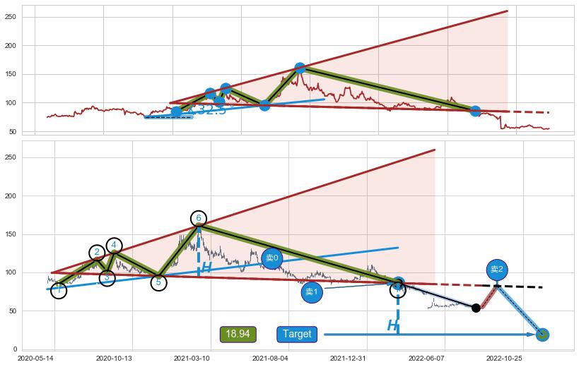 ➢ 最小反转跌幅→𝐇: 67.07 (逐步抬高阻力斜边最后的阻力点⑥与支撑边垂直距离)