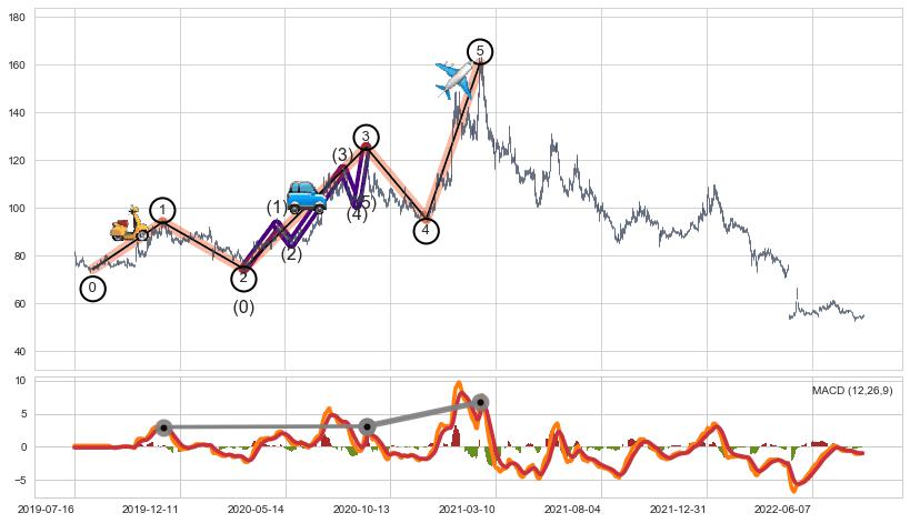 ➢ 顶部尽头线(下山虎) + 波浪理论上涨浪:浪5回调拐点信号叠加后【反向回撤率】极低,【看空】信号叠加【存续影响极大】