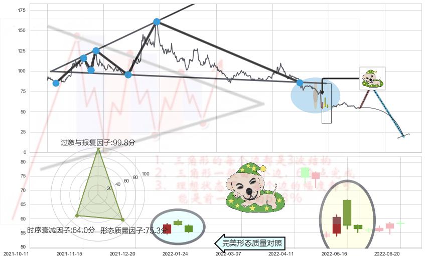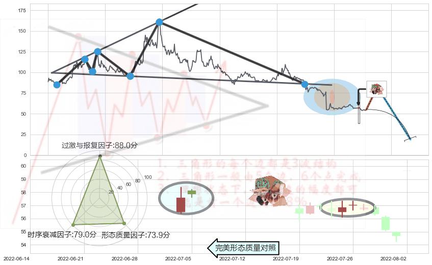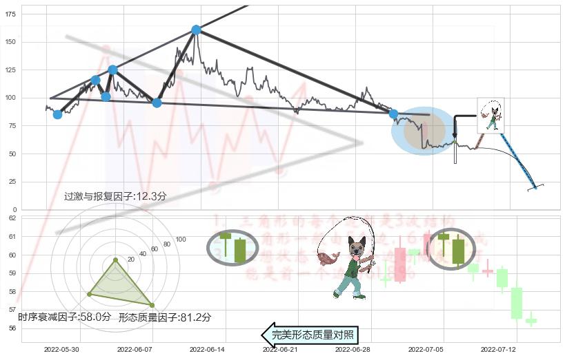 ➢ 射击之星形态 🔜 扩散三角反转支撑破位转换阻力下跌 综合量化分数:46.50 【中性】