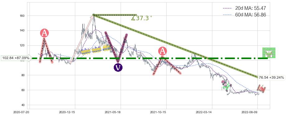♘ 阻力价格位102.84,可信任强度93.11%,距离最后交易2022-08-12形成的收盘价格54.97相差 +87.09%