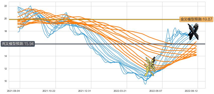 ➣ 40小时均线于(2022-08-08: 17.73)形成【死叉】基于【死叉历史模型】预测死叉后最低波谷价格: 15.56, 死叉后最低价格17.04,尚未达到预测最低波谷价格, 预期继续下跌
